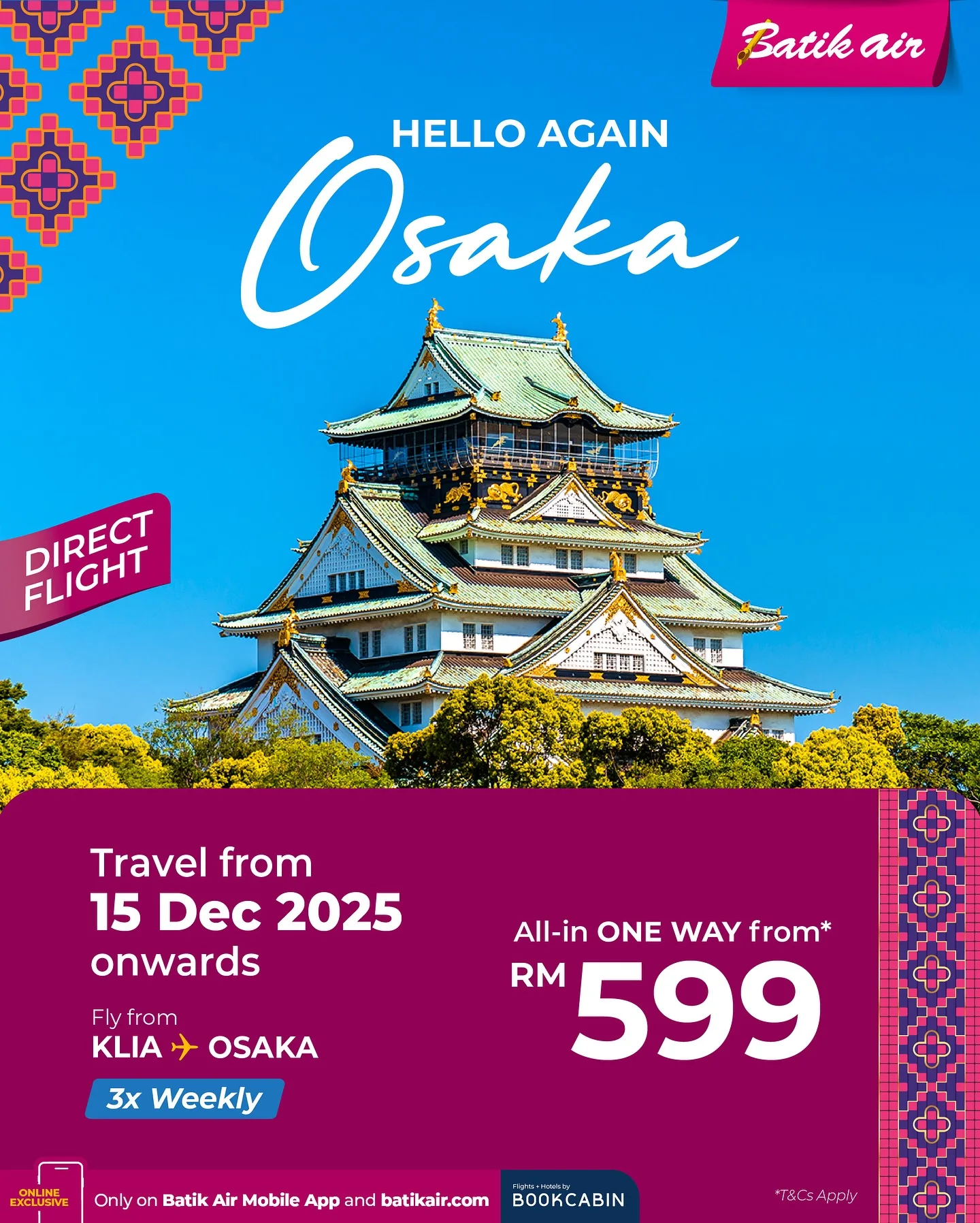 The return of the Kuala Lumpur – Osaka service reflects Batik Air’s strategic growth in North Asia, strengthening Malaysia’s aviation links and supporting two-way tourism. Japan remains one of the most sought-after destinations for Malaysian travellers, especially during the winter and cherry blossom seasons, while our country continues to welcome a growing number of Japanese visitors seeking its beaches, heritage cities, and diverse cultural experiences.