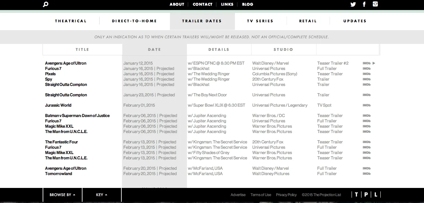 The Projection List is a new movie website that contains “the entire cinematic release schedule”, including the official & projected dates for all theatrical, home, and trailer releases”. The site claims that the clues about the trailer were given based on “a project’s shooting schedule, distributor, subject matter, director, cast, etc.”.