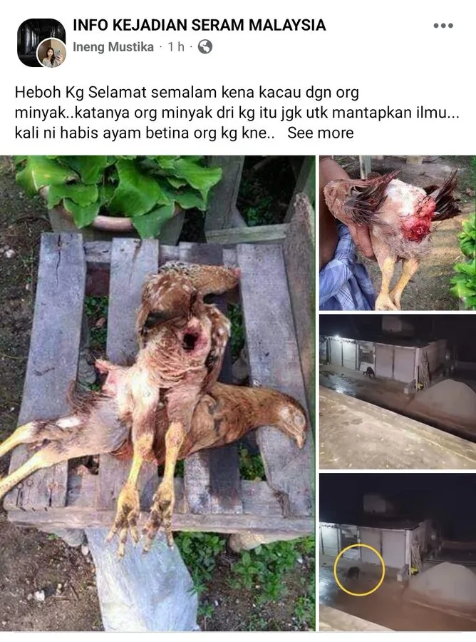 Yesterday (Tuesday, 12th December), a netizen who goes by Ineng Mustika posted on the Info Kejadian Seram Malaysia Facebook group to share a terrifying incident that happened. The (now-deleted) post showed disturbing images of dead chickens that had been sexually violated from behind. The location of the incident was said to be Kampung Selamat but it was not specified from which state.