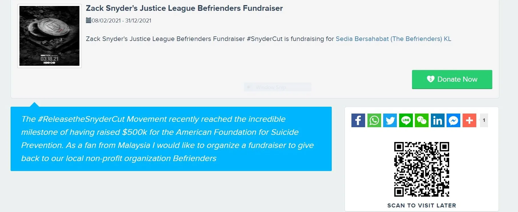 After a Malaysian witnessed such incredible achievement, a fundraiser page was created by the dedicated fan and is currently aiming to spread more awareness to help give back to the country’s local non-profit organisation Befrienders. This is also to commemorate the release of the upcoming Snyder Cut while the fundraiser is being carried out. Visit here to help the cause. It will only run until the end of March.