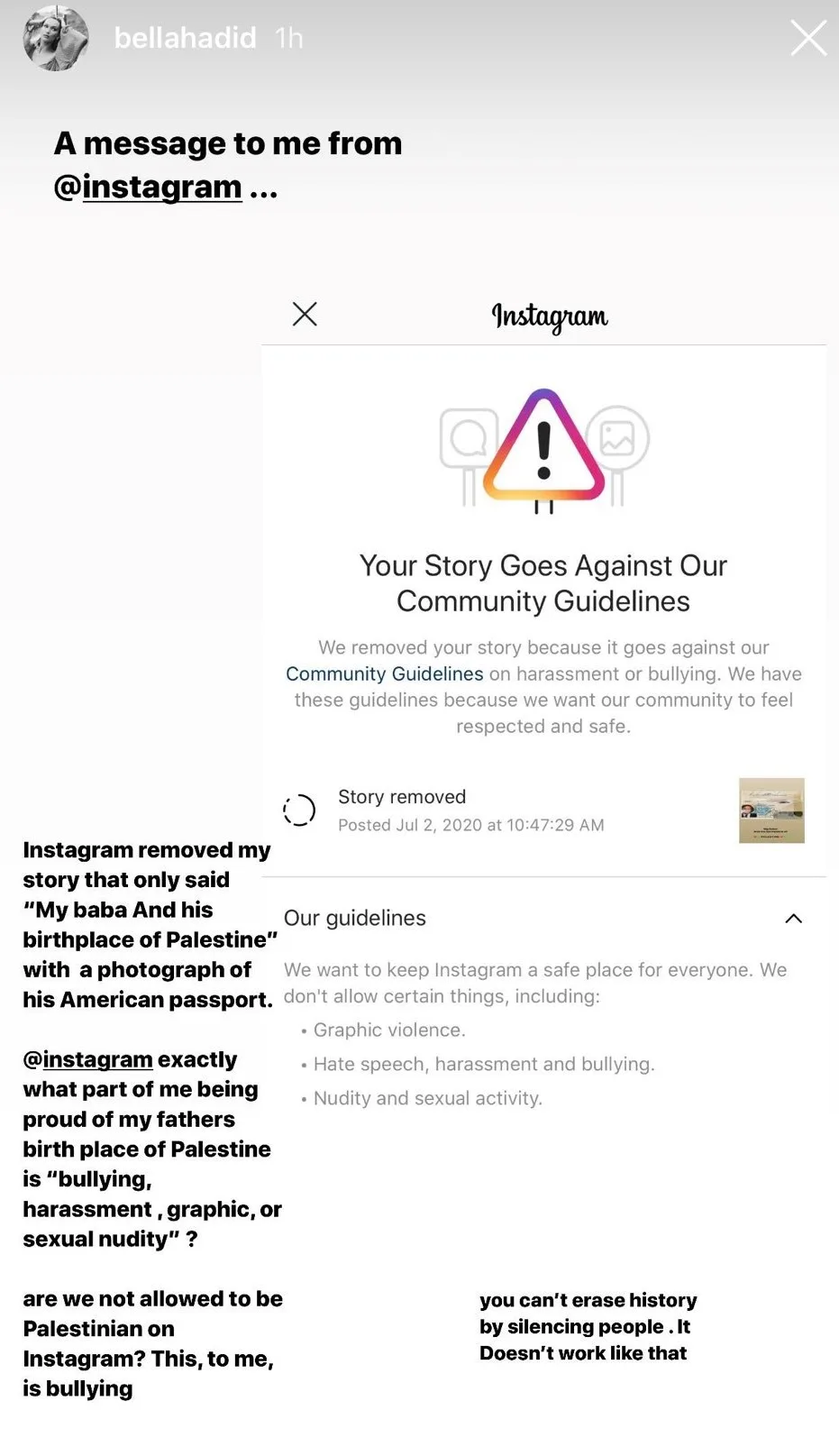 Enraged, Bella responded by questioning, “@instagram exactly what part of me being proud of my father’s birth place of Palestine is ‘bullying, harassment, graphic, or sexual nudity?'” She continued, “Are we not allowed to be Palestinian on Instagram? This, to me, is bullying.”
