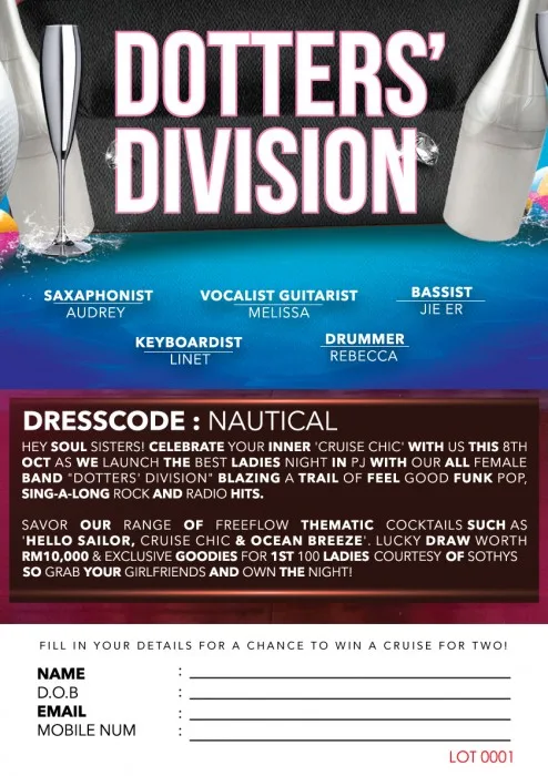 Apart from being entertained by Dotters’ Division, ladies will also get to dance the night away to the beats from in-house DJ Nima and DJ Kino who will be spinning in between sets. Not to be missed are the award winning Signature cocktails available on promo and a special treat to our ladies, savour on the range of FREE FLOW thematic cocktails such as Hello Sailor, Cruise Chic and Ocean Breeze.