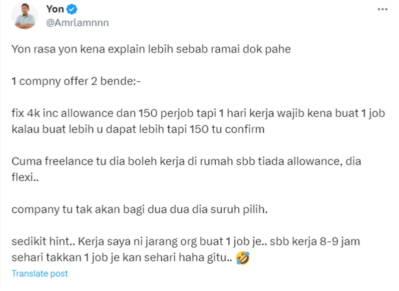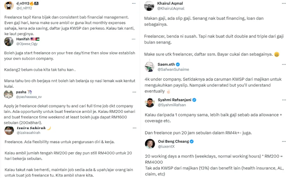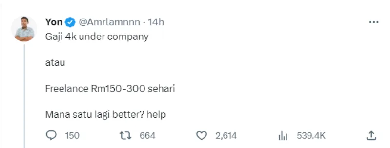 Recently, a journalist started another discussion about freelancing versus being employed by a company. In his tweet, Yon asked netizens, “RM4k salary under a company or freelance (for) RM150-RM300 per day. Which is better?”
