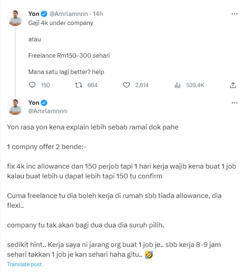 Recently, a journalist started another discussion about freelancing versus being employed by a company. In his tweet, Yon asked netizens, “RM4k salary under a company or freelance (for) RM150-RM300 per day. Which is better?”