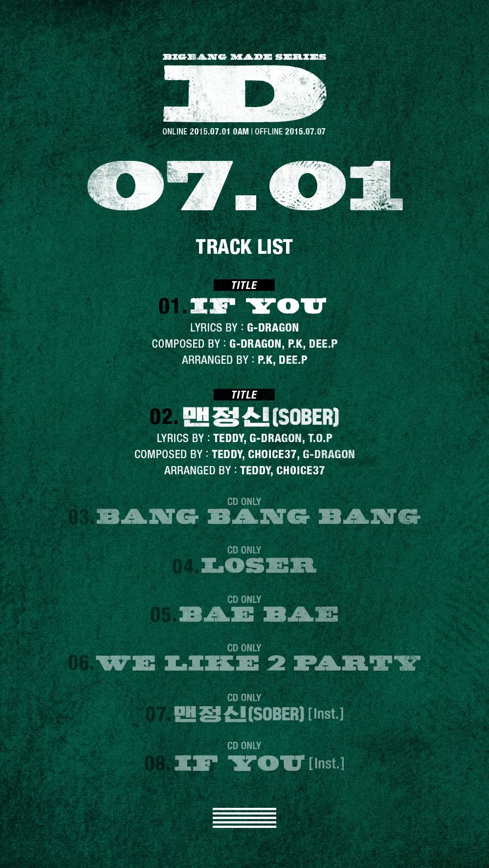 “If You” and “Sober”, which will be released tomorrow (1st July), are the BIGBANG’s releases for their third “MADE” release, MADE series “D”. The group has consistently been releasing 2 tracks per month starting from May, with the full album titled “MADE” scheduled to be released on 1st September 2015.