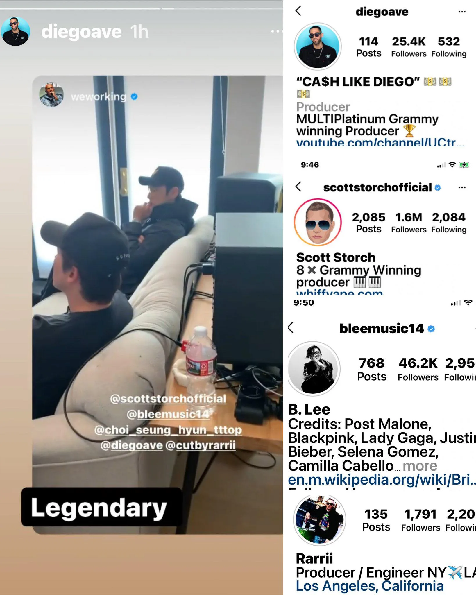 So it’s only natural for fans to get their hopes up once again, especially when T.O.P was seen at a recording studio in the United States recently. We Working Studio’s Steve Lobel recently shared a photo of the 33-year-old rapper, alongside other Grammy award-winning producers, Scott Storch and B.Lee. In addition, the CEO also tagged American record producer DJ Khaled in the same post. Two-time Grammy award winner Diego Ave also uploaded a post with T.O.P on his IG Story.