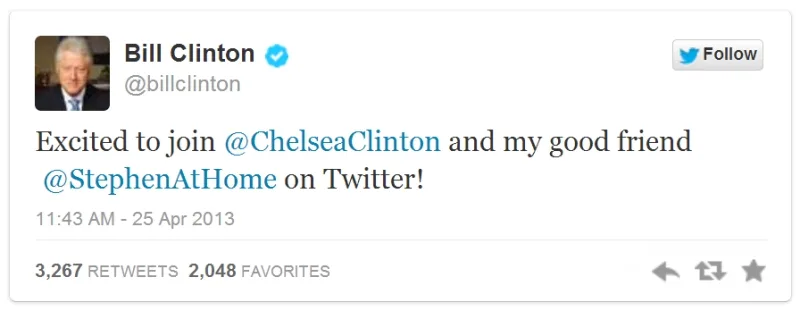 Also, Bill Clinton’s daughter Chelsea Clinton (@ChelseaClinton) is quite a seasoned Twitter user so we’re pretty sure he knows she’s on it. In fact, one of his first few tweets were directed to her: