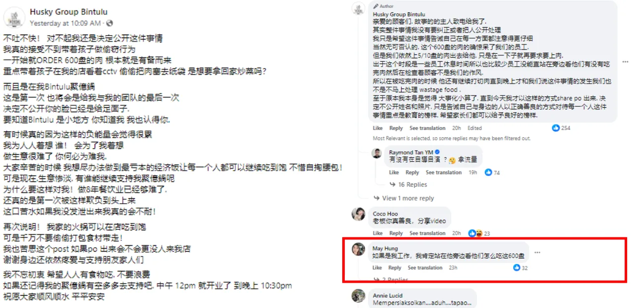 The hotpot restaurant owner later took to Facebook to call the family out, claiming he knew them. “You know Bintulu is a small place,” he lamented. “You know me, and I know you.” He added that he had purposefully left their faces and names out to avoid publicly humiliating them. However, he had opted to call them out because he felt “stealing with your children (present) is unacceptable“.