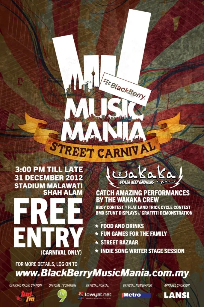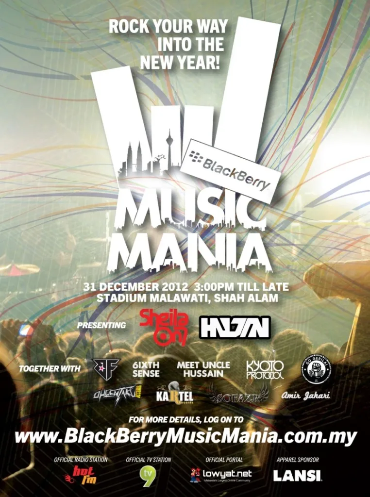 Get ready to party and usher in 2013 as Research In Motion (RIM) unveil the BlackBerry Music Mania Concert and Carnival, set to take place on 31st December 2012 at Stadium Malawati, Shah Alam.
