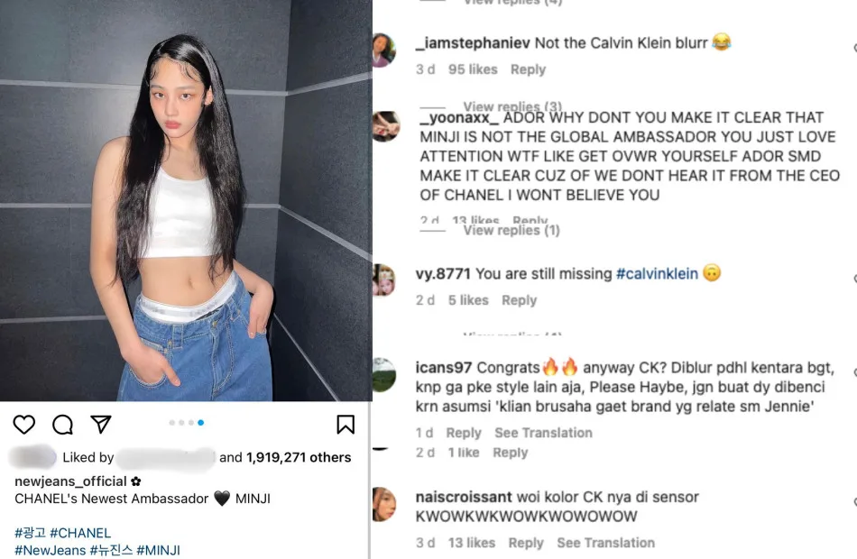 While Jennie received mostly praise for her new Calvin Klein photos, another fellow idol did not receive the same love. Girl group NewJeans recently announced on their official Instagram that member Minji (민지) is the new brand ambassador for Chanel Korea. However, even though censored, netizens noticed that the girl group’s main dancer was wearing Calvin Klein’s underwear in one of the photos of the announcement post.