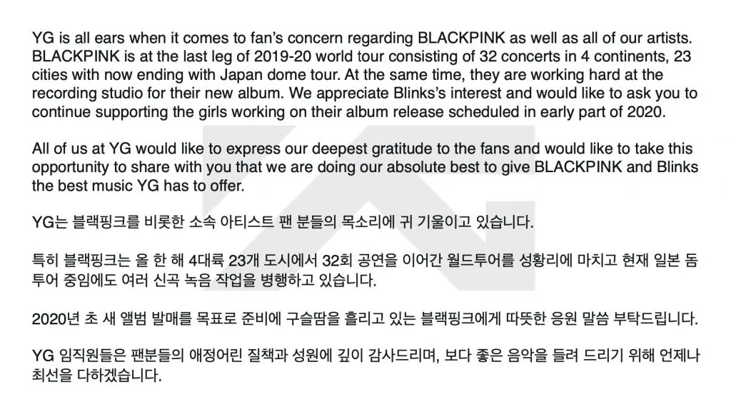 As a response, YG finally took to Twitter to address the ongoing speculations. They posted a statement in both English and Korean. For those who are interested, check out their statement here: