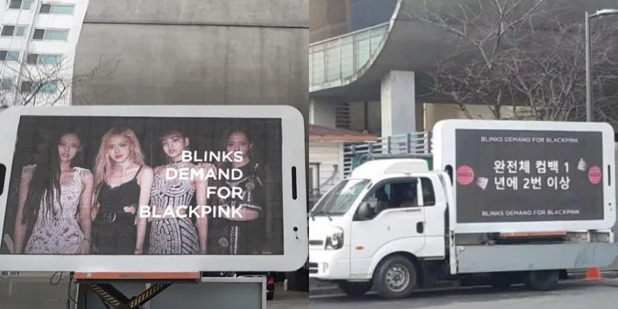 In addition, BLINKs also made headlines after a fan-made truck was placed outside of the YG headquarters building. As seen in the photo collage above, the vehicle had billboard ads that read “BLINKs are demanding for BLACKPINK”.