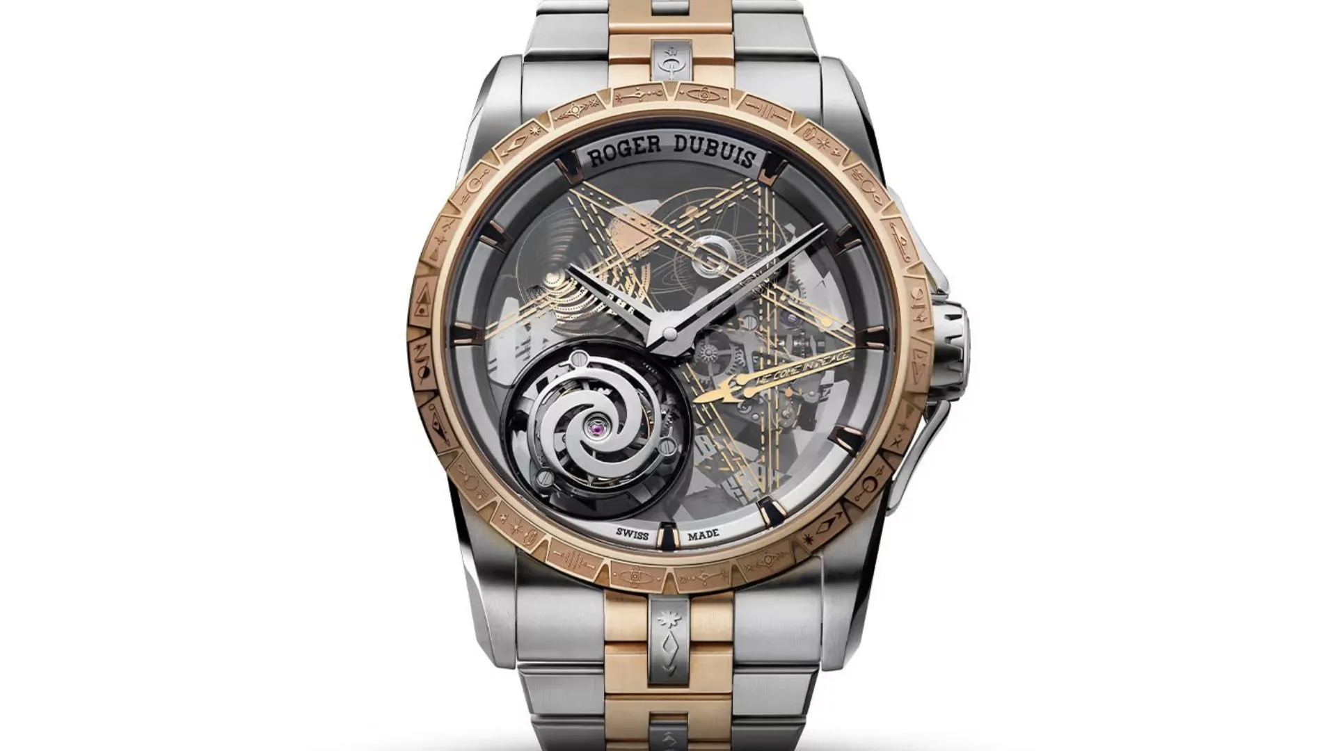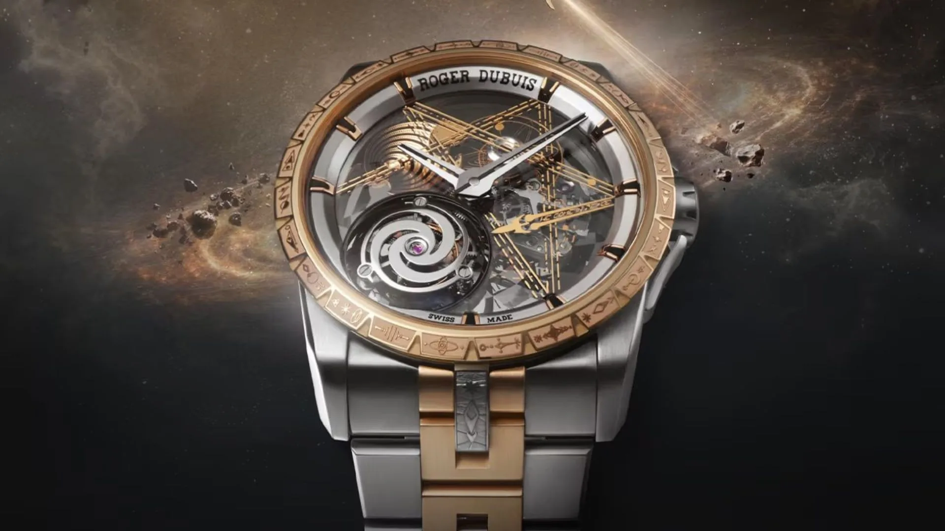 Its elegant, spiral motion is reminiscent of Roger Dubuis’s famous astral form and the workings of the tourbillon complication. The design is further embellished with Dr. Woo’s recurrent rocket motif on the sapphire crystal with the words “We Come in Peace,” a laser-engraved spider at ten, and three ethereal pink gold nebulas at nine.