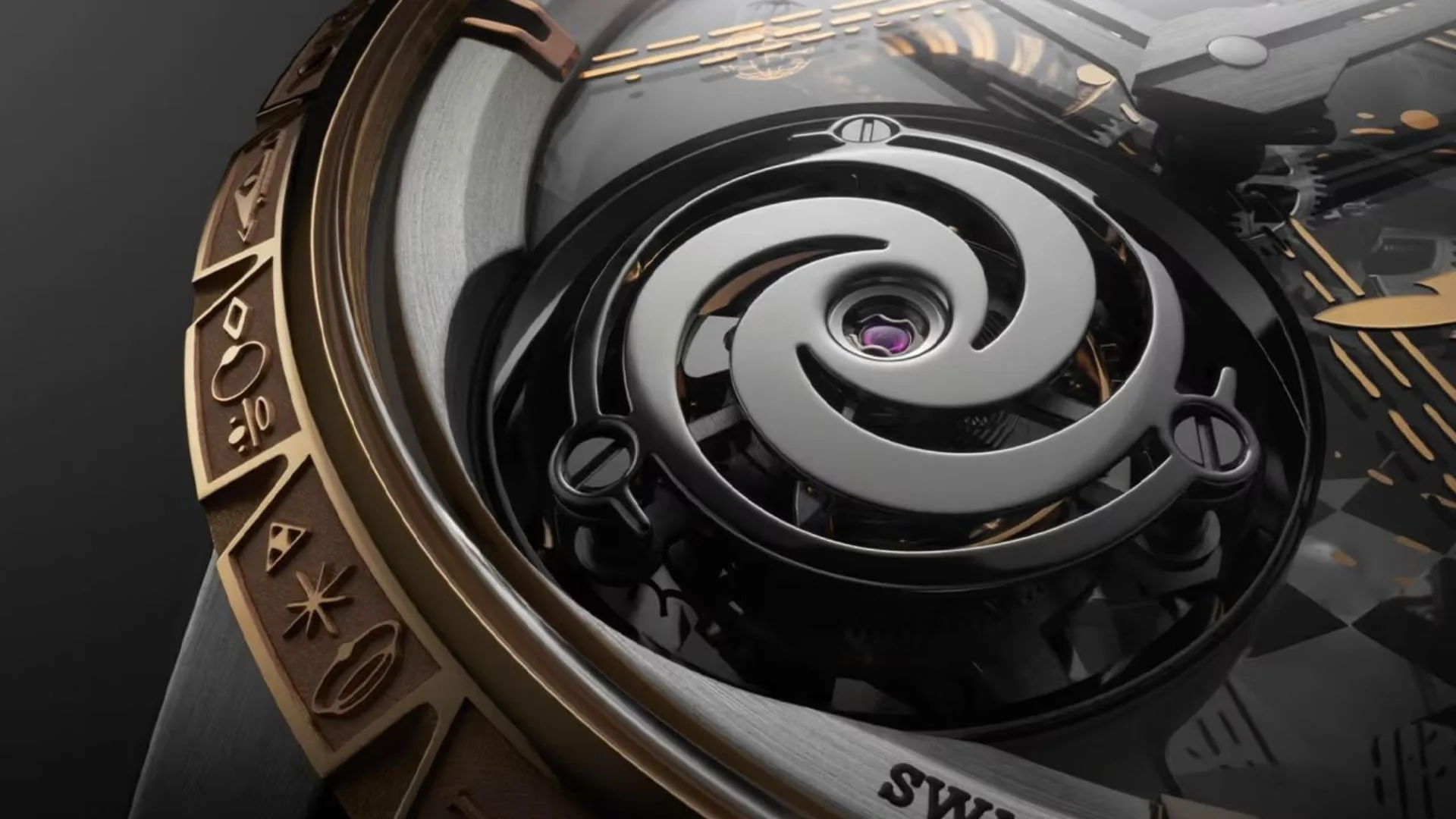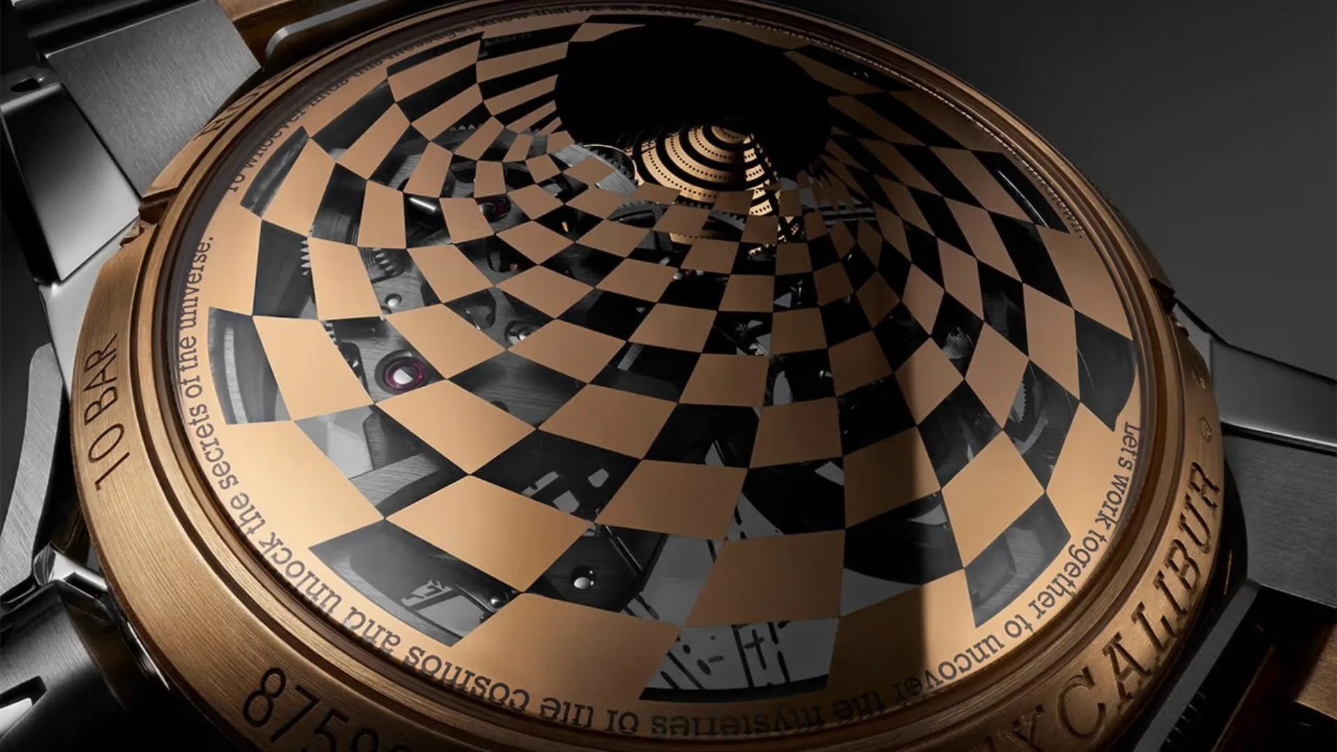 As a visual representation of cosmic depth and spatial distortion, this motif reappears on the caseback as a striking chequerboard spiral on sapphire crystal. Additionally, a message inviting distant lifeforms to engage in a dialogue of discovery is etched on the back.