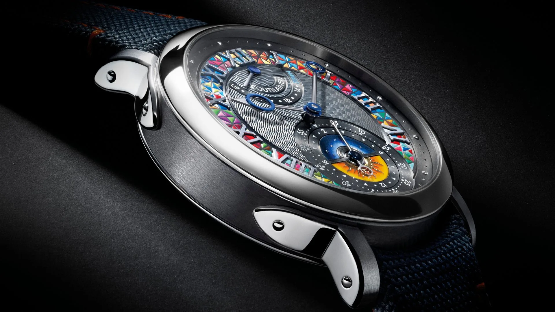 The painting took 32 hours to perfect and uses 28 different colours. Hand-engraved sun and moon-inspired motifs in saffron and blue hues, modelled after Louis Vuitton’s monogram flower, adorn the lower sub-dial of the day-night disc.