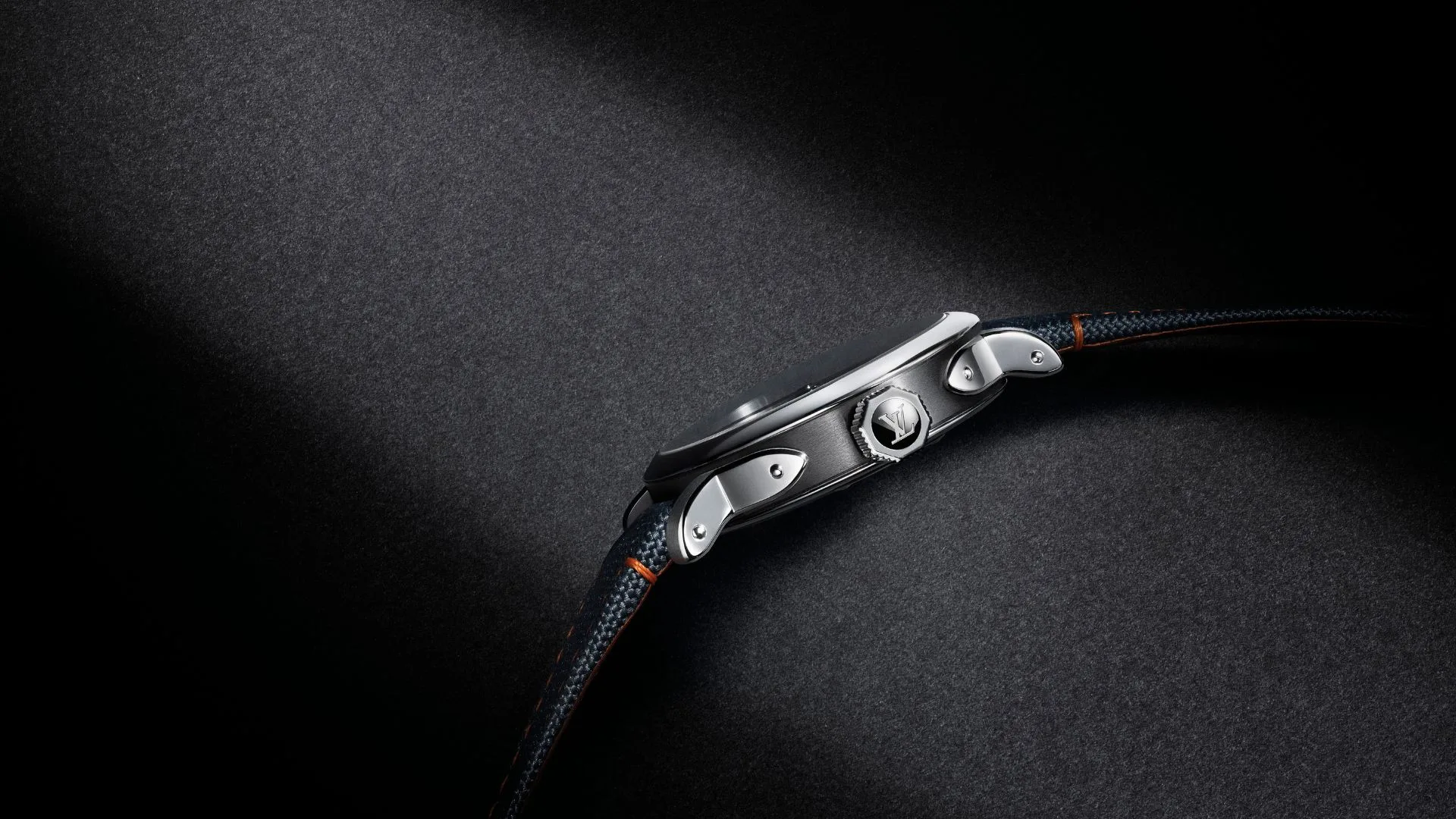 With angular details and rivets that evoke the brass brackets on the vintage leather carriers, the watch’s lugs are reminiscent of the brand’s iconic trunks.