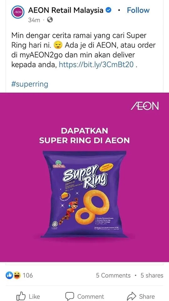 AEON Retail Malaysia recently posted on their official Facebook page promoting that the Super Ring snacks are available in stores at all their outlets and even on their online store. “We heard a lot of people are looking for Super Rings today 😌 They’re right here at AEON or you can order them online at myAEON2go and we’ll send them over to you,” the company captioned on their post.