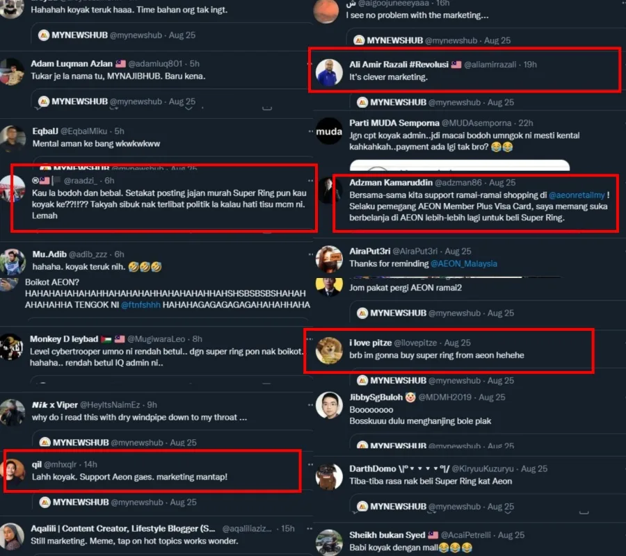 Twitter user @mynewshub shared a screenshot of someone’s very lengthy Facebook post calling AEON out for the “offensive” Super Ring promo, citing it was a cheap marketing strategy to use a trending controversial topic. The Twitter user called on everyone to boycott the company but most netizens found the whole thing simply amusing.
