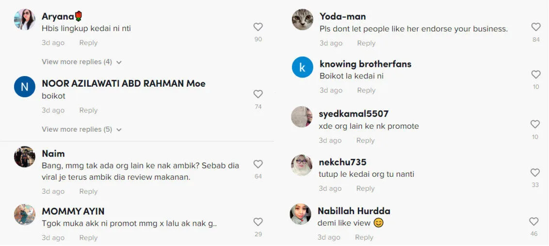 Many claimed the restaurant had only asked for her review since she had gone ‘viral’ last week. “Please don’t let people like her endorse your business,” one comment said sternly. Others stated they would be boycotting the shop. “Looking at her while she promotes makes me not want to visit the restaurant,” another claimed.