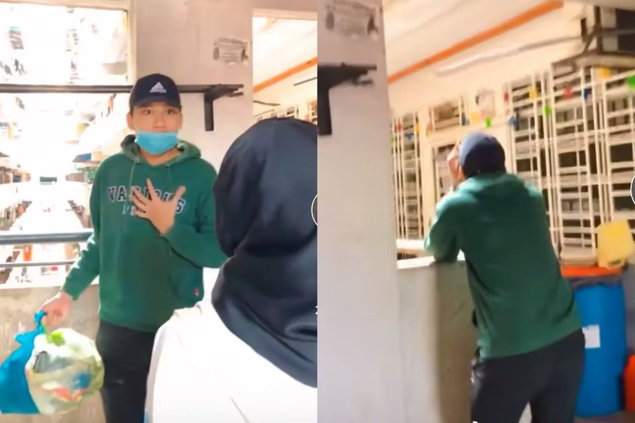 In the video, a girl was seen waiting for her boyfriend right around the corner. He was supposed to pass by to take out the trash. When he saw his girlfriend, it was as if he had just seen a ghost (a pretty one that is). He kept massaging his chest (probably had a mini heart attack?) when he saw his girlfriend who was supposed to be 5 hours away. He immediately dropped the trash he took out and he got all teary-eyed (aww!)