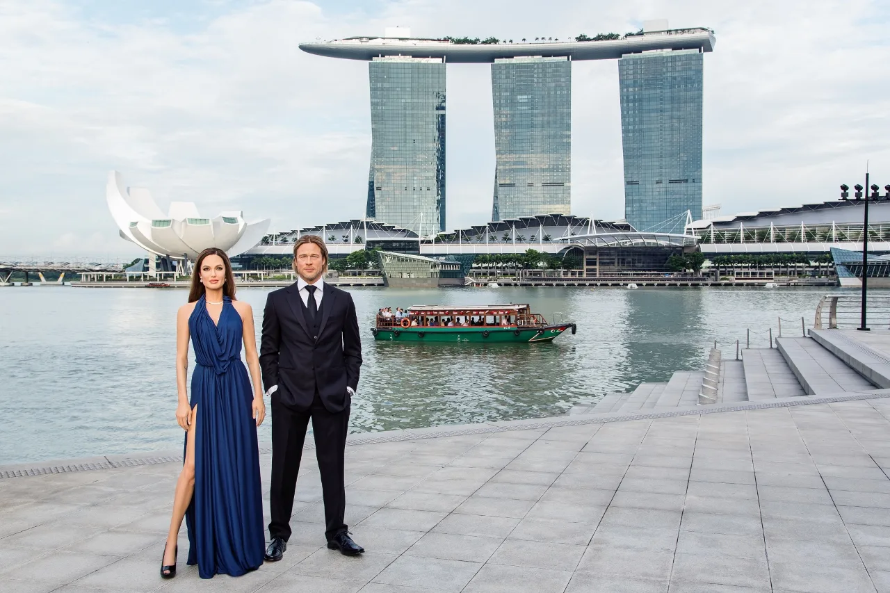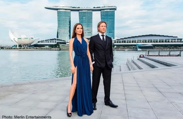 A-list Hollywood celebrities Brad Pitt and Angelina Jolie aka Brangelina have arrived in Singapore. The superstar couple were spotted at One Fullerton on Wednesday, 27th August. Of course, it’s not really them. It’s their wax figures. Close enough!