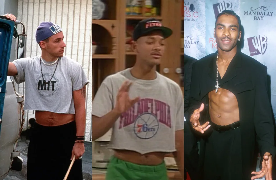 According to fashion archives, men’s crop tops or also known as ‘midriff’ were already popular during the late 80s among Western culture. It is traced back to American football athletes who would crop their shirts for proper ventilation during football practice. Soon after, it became a thing and was seen worn by celebrities like Adam Sandler in “Airheads” (1994) and Will Smith on “Fresh Prince Of Bel-Air” (1990). R&B singer Ginuwine even donned a red velvet cropped suit during appearance at an award show.