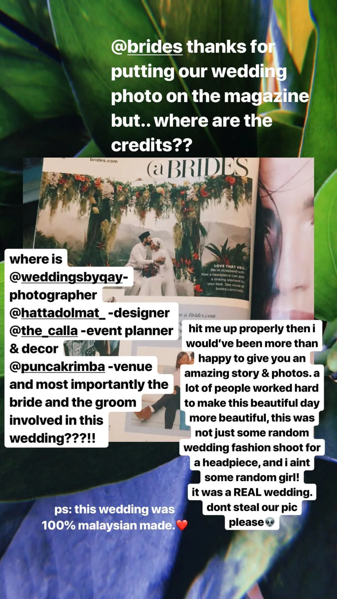 The 31-year-old Malaysian singer has taken to Twitter and Instagram last night to point out BRIDES’ shocking blunder. “@brides, thanks for putting our wedding photo on the magazine, but where are the credit?”
