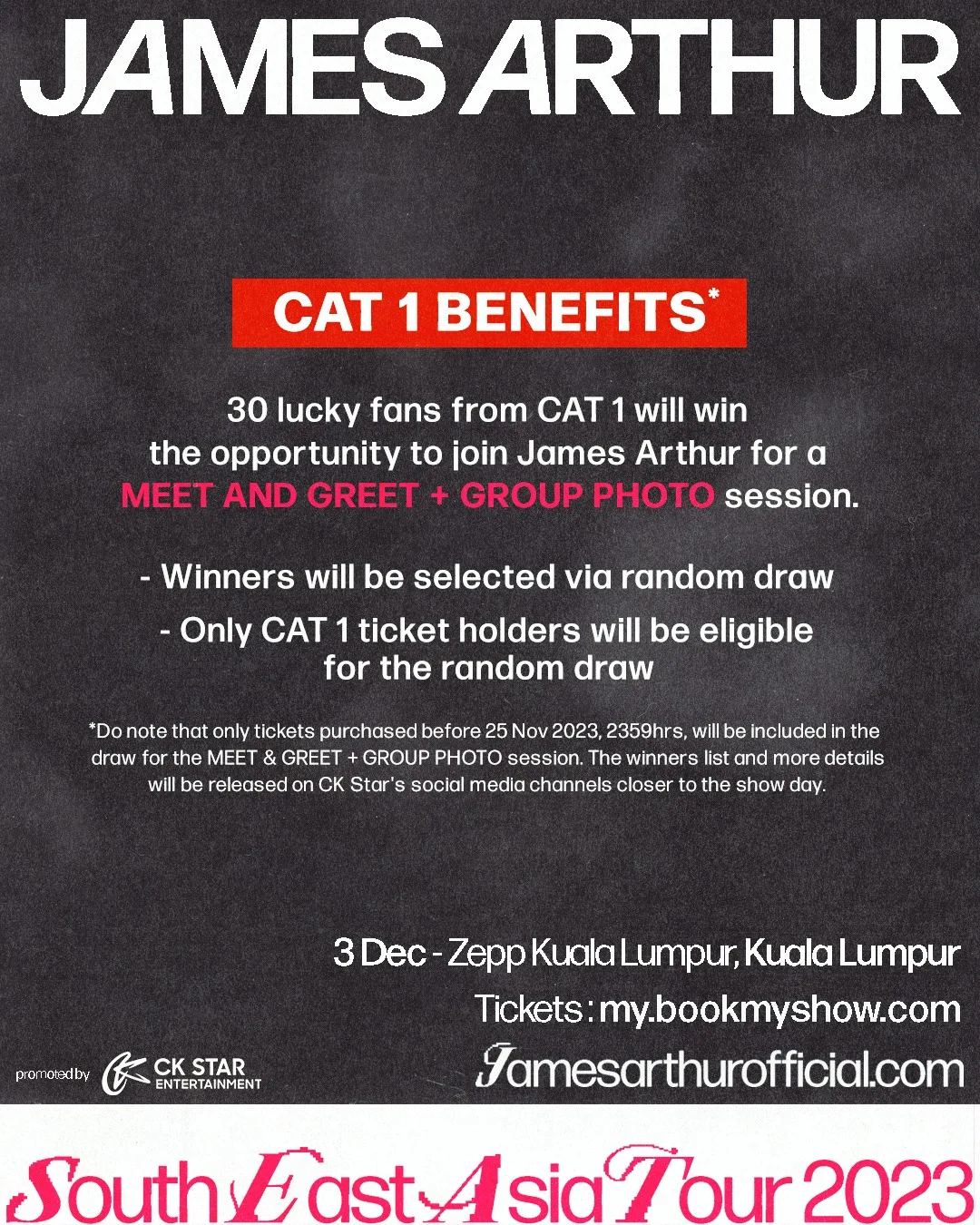30 lucky fans from CAT 1 will stand a chance to meet and greet James Arthur plus an opportunity for a group photo. (Winners will be selected via random draw). Tickets purchased before 25th Nov 2023, 2359hrs will be included in the draw for the meet and greet + group photo session.