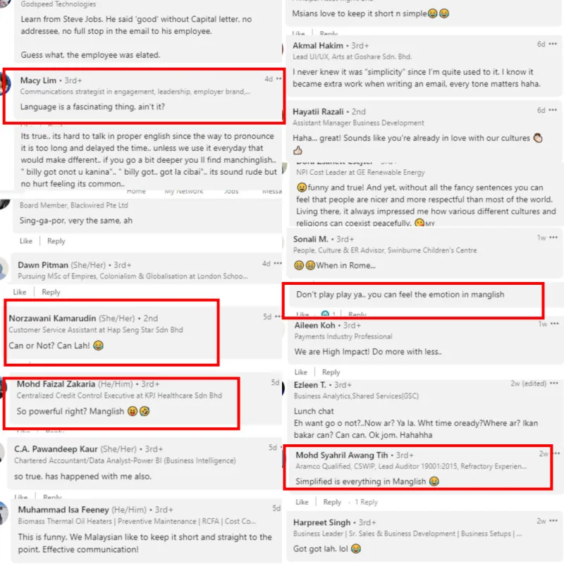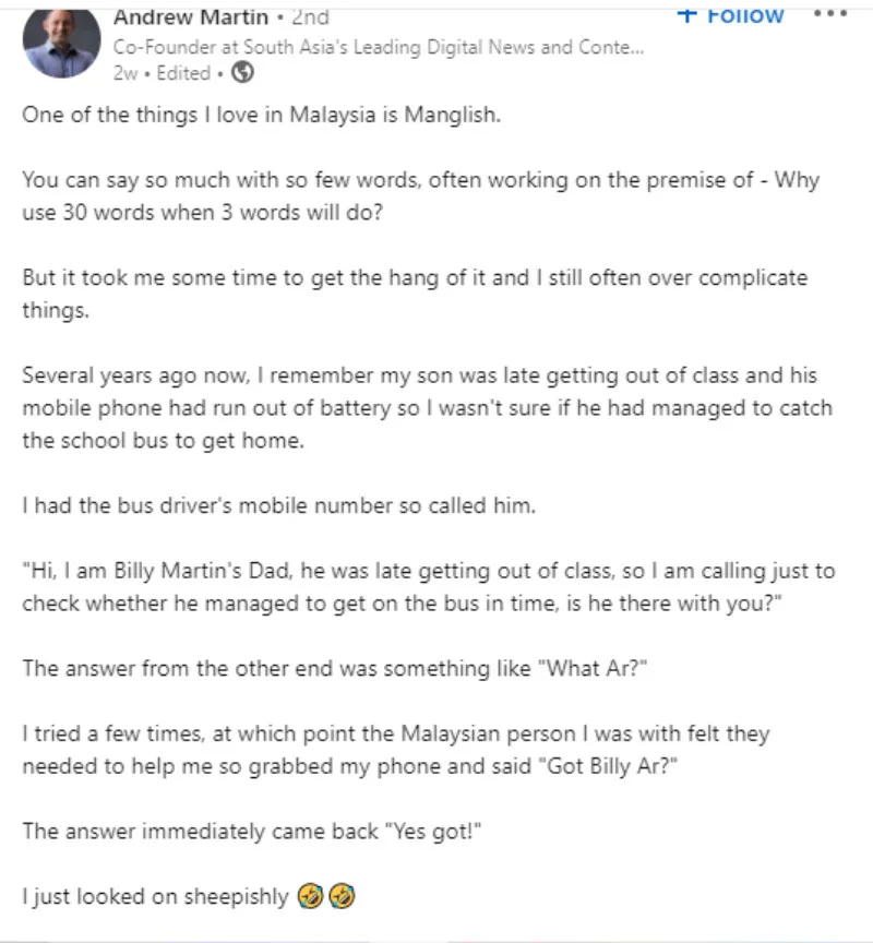 According to the businessman, he loves the use of “Manglish” as it makes talking much easier. “You can say so much with so few words, often working on the premise of – Why use 30 words when 3 words will do?” he said on his LinkedIn profile. He then shared his experience of someone helping him by using “Manglish” when he was talking to a bus driver on the phone to check up on his son.