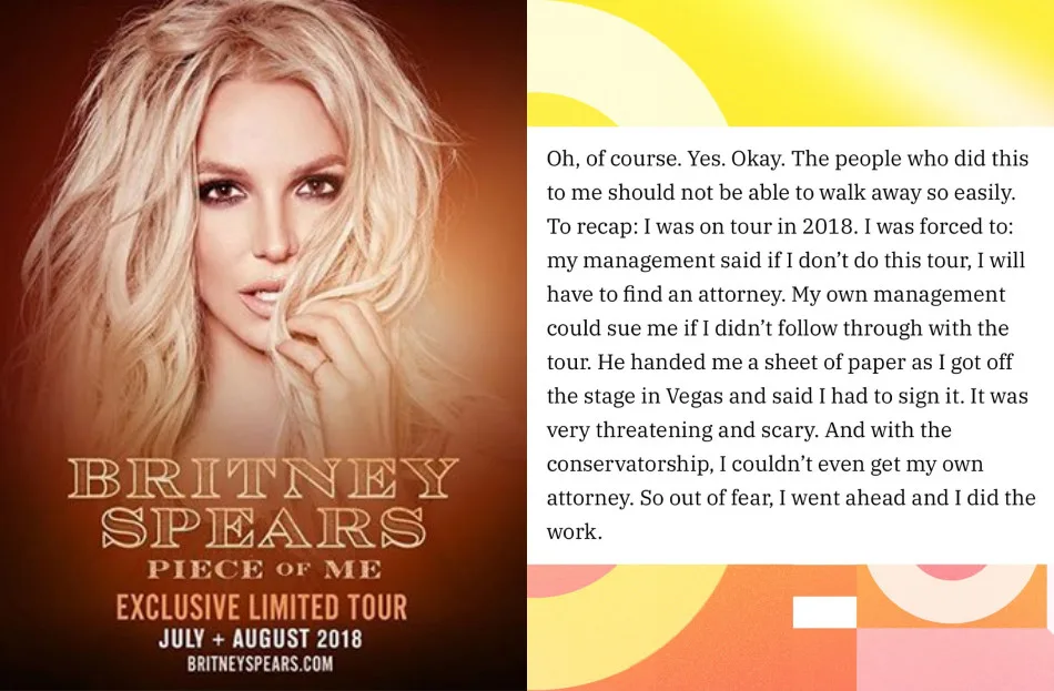 “The people who did this to me should not be able to walk away so easily. To recap: I was on tour in 2018. I was forced to: my management said if I don’t do this tour, I will have to find an attorney. My own management could sue me if I didn’t follow through with the tour. He handed me a sheet of paper as I got off the stage in Vegas and said I had to sign it. It was very threatening and scary. And with the conservatorship, I couldn’t even get my own attorney. So out of fear, I went ahead and I did the work.