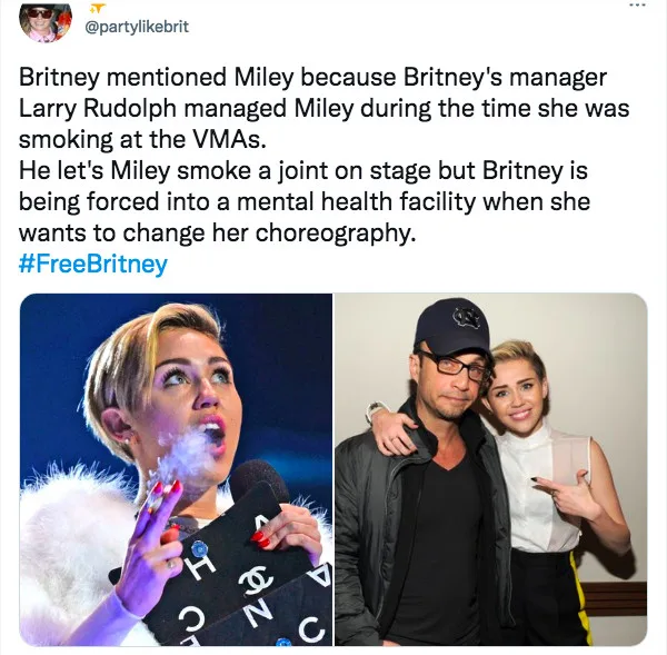 And the reason I’m telling you this is because I don’t think how the state of California can have all this written in the court documents from the time I showed up and do absolutely nothing — [they] just hired, with my money, another person to keep my dad on board. Ma’am, my dad and anyone involved in this conservatorship and my management who played a key role in punishing me — ma’am, they should be in jail. They’re working for Miley Cyrus as she smokes joints onstage at the VMAs — nothing has ever been done to this generation for doing wrong things.