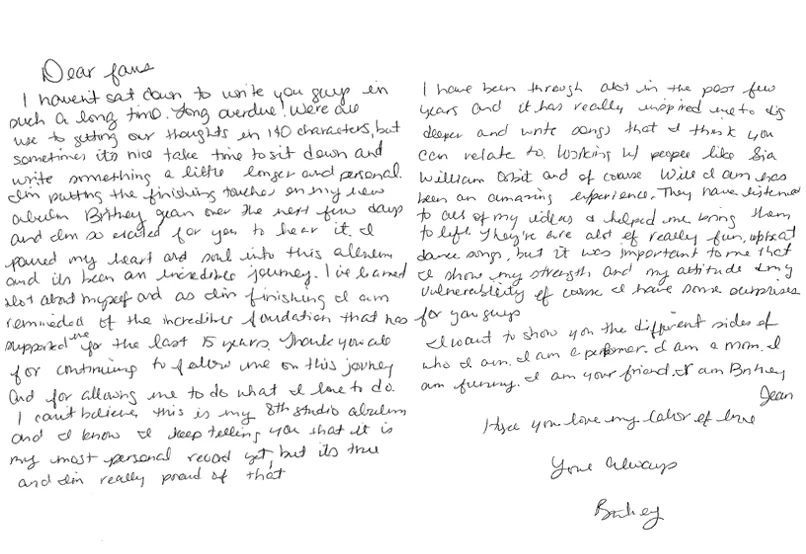 I haven’t sat down to write you guys in such a long time. Way overdue! We’re all used to getting our thoughts in 140 characters, but sometimes it’s nice to take time to sit down and write something a little longer and personal. I’m putting the finishing touches on my new album Britney Jean over the next few days and I’m so excited for you to hear it. I poured my heart and soul into this album and it’s been an incredible journey. I’ve learned a lot about myself and as I’m finishing, I am reminded of the incredible foundation that has supported me for the last 15 years. Thank you all for continuing to follow me on this journey and for allowing me to do what I love to do. I can’t believe this is my 8th studio album and I know I keep telling you that it is my most personal record yet, but it’s true and I’m really proud of that.