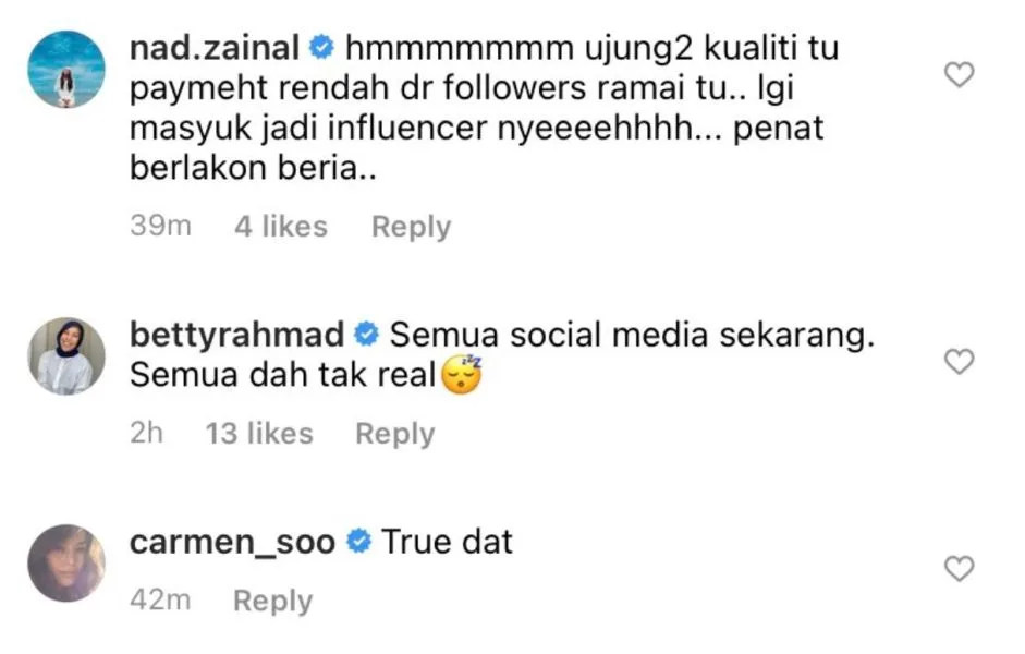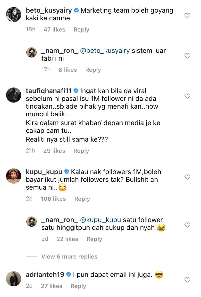 The comments section has been flooded with many of Nam Ron’s followers, which mostly consist of well-known celebs and directors, sharing their opinions on the requirement set by the broadcasting company. Among those who came forth to air their thoughts include Nabila Huda, Beto Kushairy, Sharifah Amani and also Adrian Teh, just to name a few.