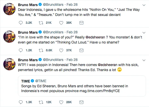 “I was poppin in Indonesia! Then here comes @edsheeran with his sick, perverted lyrics, gettin us all pinched! Thanks Ed. Thanks a lot,” the funk revivalist tweeted.