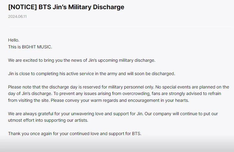 It is claimed by the idol’s agency, BIGHIT MUSIC, that the official discharge ceremony will only be held among military personnel. The company also issued a statement in which fans are not allowed to gather at the base, especially with the possible presence of other members at the military base. However, such news about the members taking a leave to attend Jin’s discharge ceremony hasn’t been confirmed yet.