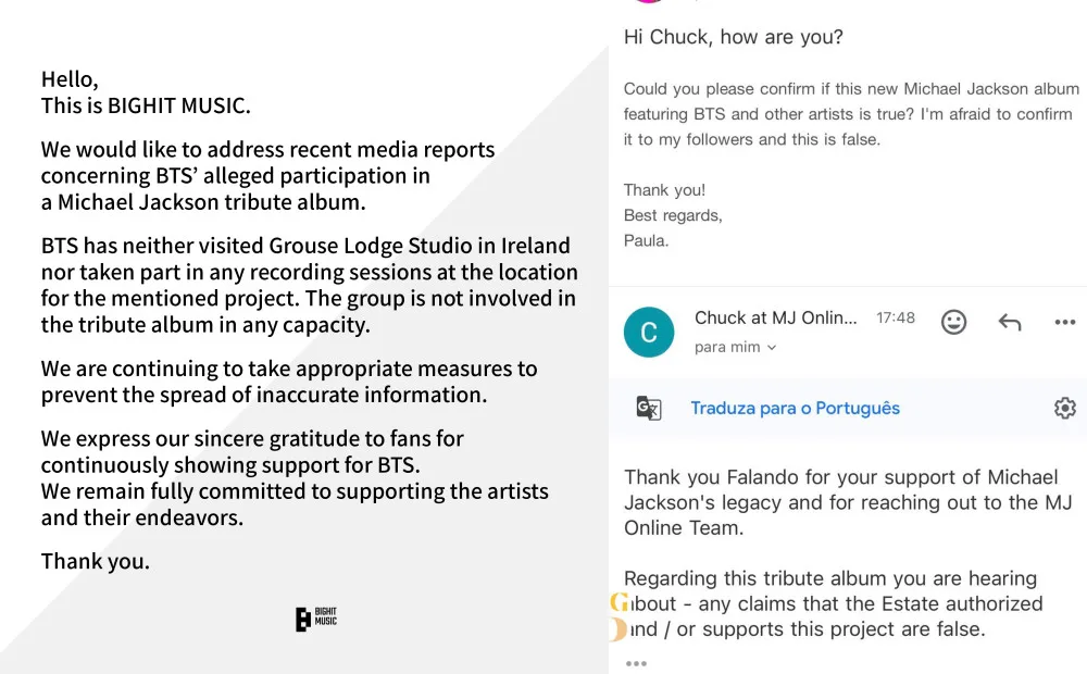 Not long after news of the supposed Michael Jackson tribute album began circulating, both the late icon’s estate and BIGHIT MUSIC issued statements to clarify the project and the artists’ involvement. Read their full statements below: