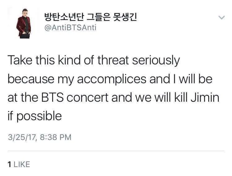 They also threatened to shoot Jimin during BTS’ upcoming concert in the US and urged ARMYs to “take this threat seriously”. AntiBTSAnti also exclaimed that they and their accomplices will “kill Jimin if possible”.
