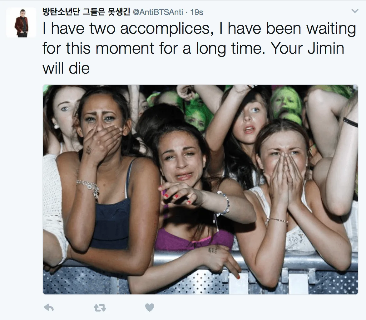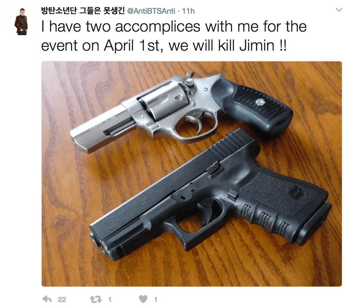 BTS’ Jimin has fallen victim to a few vicious anti-fans, who sent death threats to him via Twitter. It all started when several users accused BTS of sexually harassing fans and claimed that Jimin hates international fans.
