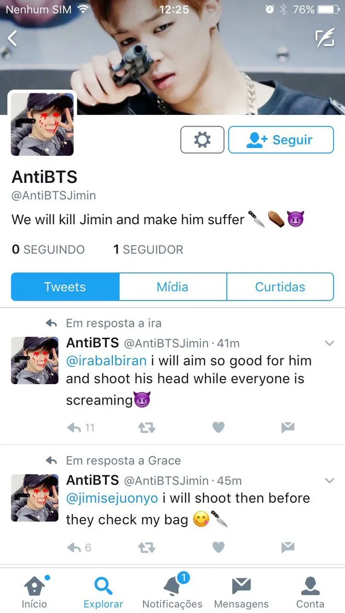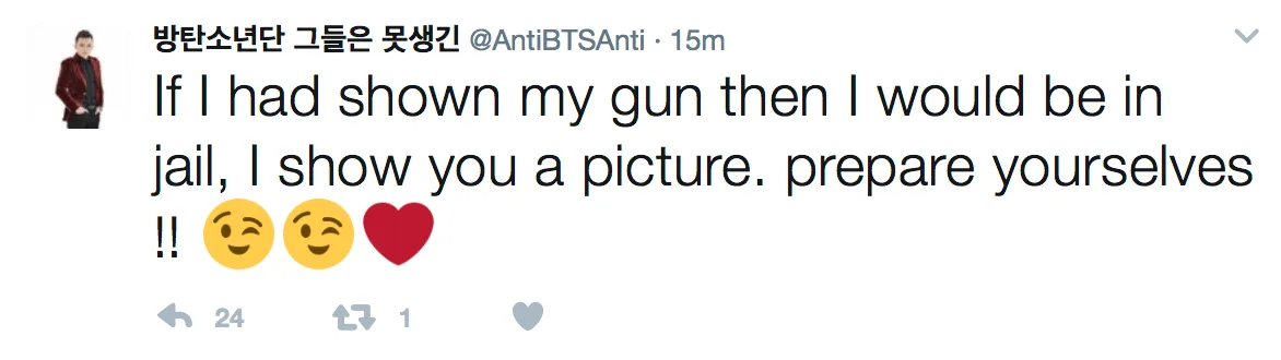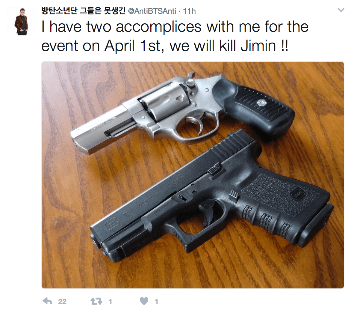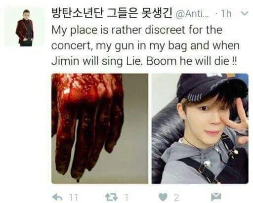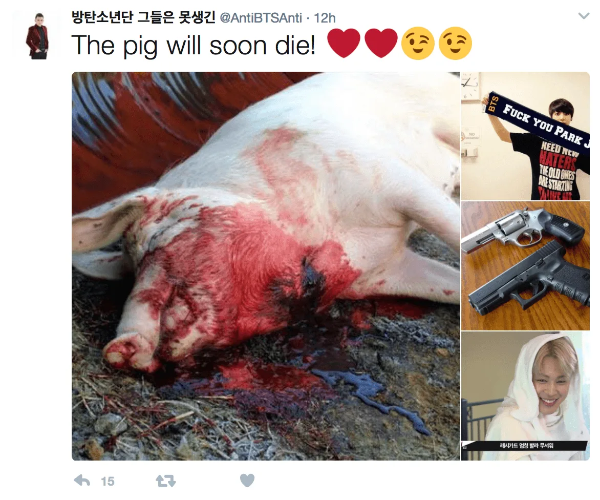 2 of the users under fire are @AntiBTSJimin and @AntiBTSAnti, who were particularly brutal in their tweets against Jimin. The persons uploaded photos of guns and even posted gory photos of slaughtered animals.