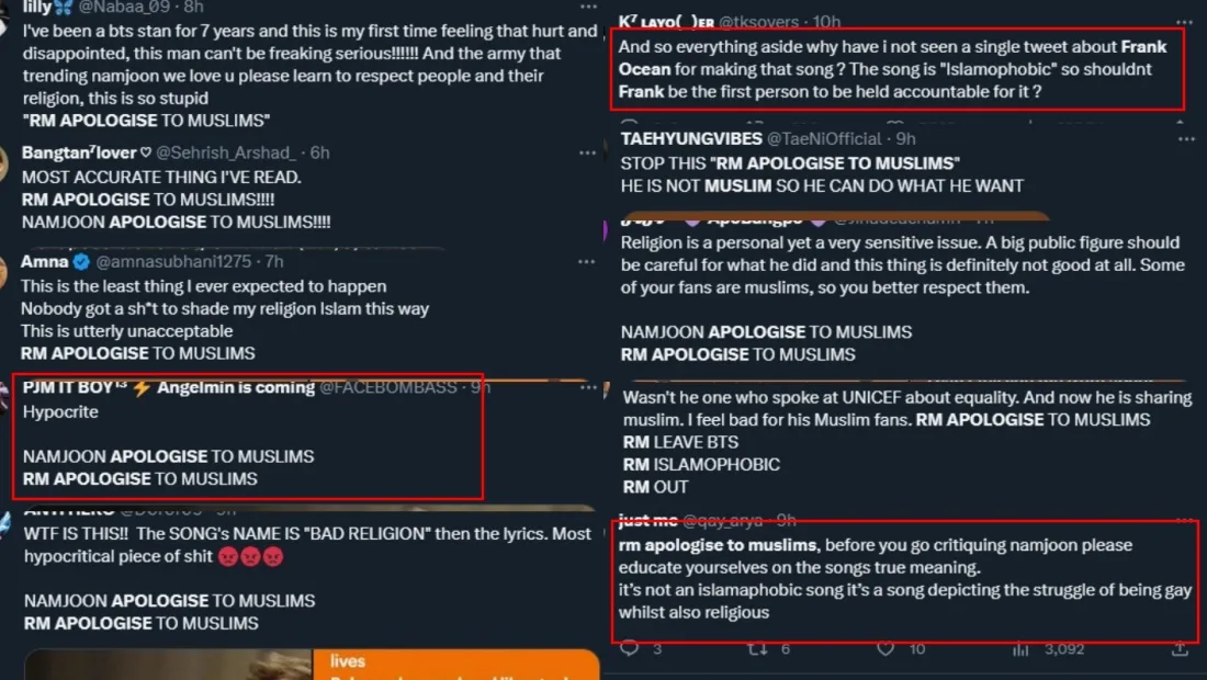 Some parts of the lyrics read, “And you say ‘Allahu Akbar’, I told him, ‘Don’t curse me’, ‘Bo Bo, you need prayer’, I guess it couldn’t hurt me, If it brings me to my knees, it’s a bad religion”. Many of BTS’s Muslim fans were furious after seeing their idol posting a problematic song, hence the hashtag #RMAPOLOGISETOMUSLIMS” trended on Twitter. A large number of ARMYs accused the rapper of being a hypocrite while others commented he should’ve been more careful with what he choose to share on social media.