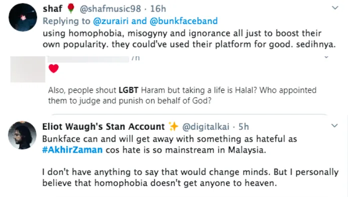 While some were horrified by the hate speech incited in “Akhir Zaman” (and are rallying for the song to be reported and taken down), others have defended Bunkface, saying that everyone is entitled to their own opinion.
