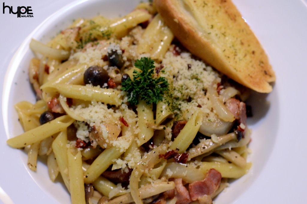 And finally, we came to our last dish of the night: “Aglio Olio with Pork Bacon”. It is a simple pasta dish that used penne pasta, topped with fried pork bacon, mushroom, herbs, and chilli flakes. It was sided with a crispy garlic bread as well. There’s nothing much to shout about this dish, but we think it’d be served as a perfect lunch for everyone as it is priced at RM16.90.