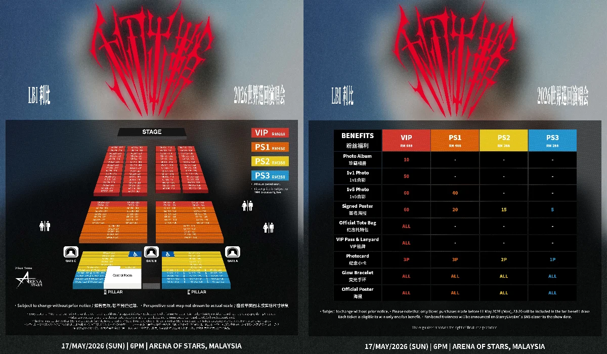 Tickets to LBI 2026 Blades Drawn World Tour in Malaysia are priced at RM688 (VIP), RM488 (PS1), RM388 (PS2) and RM288 (PS3).