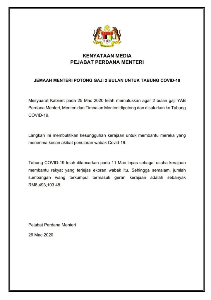 “This measure demonstrates the government’s commitment in helping those affected by the pandemic. The Covid-19 fund was launched on March 11 as part of the government’s effort to help the people affected by this virus. Up until yesterday (25th March), the total donation including the government’s grant was RM8,493,103.48.”