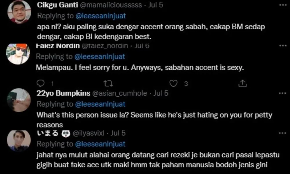 Some even praised the Sabahan community’s way of speaking, appearance and friendly manner. “I really like to hear the Sabahan’s accent, it’s nice to hear them speak Malay and their English is good,” a user wrote. Another replied to the post saying, “This is too much. I feel sorry for you. Anyways, the Sabahan accent is sexy.”