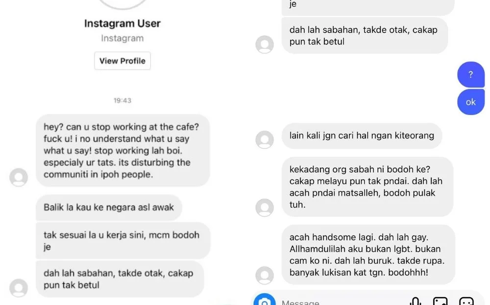 According to the post, the netizen had requested the Chinese-Kadazan born to stop working at the café simply because they could not understand a word he was saying. “Stop working lah boy. Especially your tattoo. It’s disturbing the Ipoh community,” the netizen wrote. “Go back to your country. It’s not suitable for you to work here. You have no brain. You can’t even speak properly,” the netizen added.