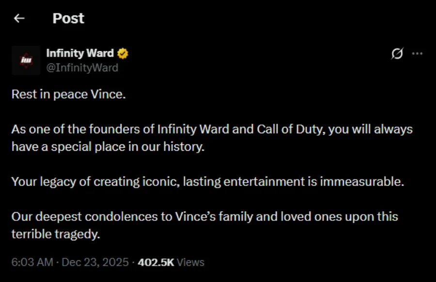 The car subsequently caught fire, and it was also reported that a passenger was ejected from the vehicle and died at the scene. At the time of writing, it is unclear what could have caused the accident, as investigations are still ongoing. “As one of the founders of Infinity Ward and Call of Duty, you will always have a special place in our history. Your legacy of creating iconic, lasting entertainment is immeasurable. Our deepest condolences to Vince’s family and loved ones upon this terrible tragedy,” Infinity Award wrote in a statement.