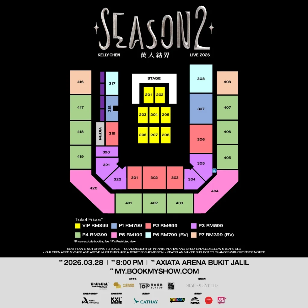 - Ticket Prices: VIP: RM899, P1: RM799, P2: RM699, P3: RM599, P4: RM399, P5: RM199