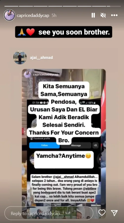 Ajai later took to his Instagram to issue his response to the “Abang Nak Tegur” rapper’s post on social media. “We are all the same, we are all sinners. Regarding my issue with Ebit Lew, let us settle that as brothers. Thanks for your concern,” he wrote on his IG Story. “Let’s catch up for ‘yam cha’ session soon,” to which Caprice replied, “See you soon brother.”