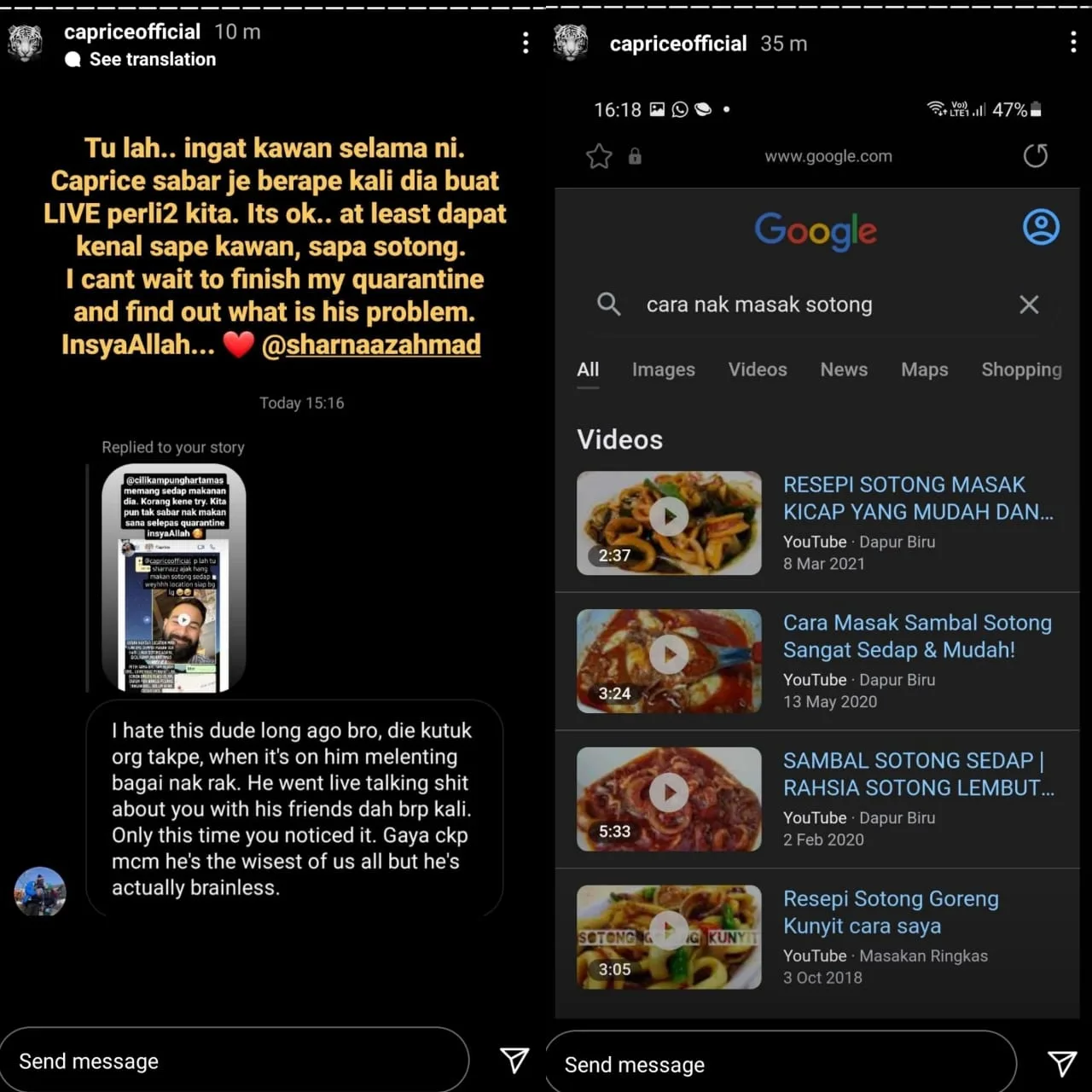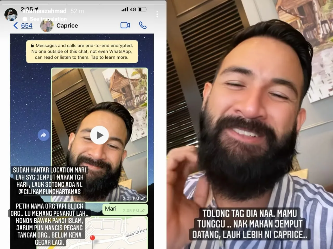 Sharnaaz also asked his followers to inform Caprice that he is waiting for the rapper at a restaurant located in Hartamas. Caprice, through his Instagram Story, shared a screenshot of a message and remarked that he has been patient all this while, referring to the time where Sharnaaz kept making jokes about him during his IG Live.